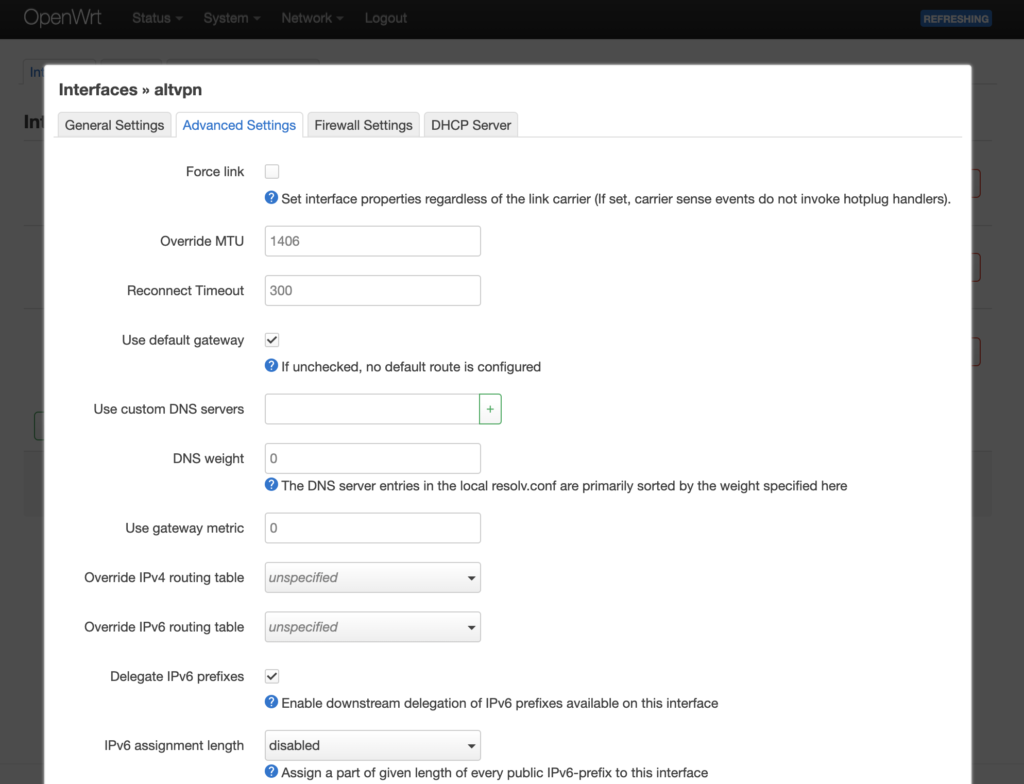 В диалоговом окне ввести желаемое имя нового VPN подключения (например, altvpn) и выбрать тип протокола OpenConnect и нажать Create interface